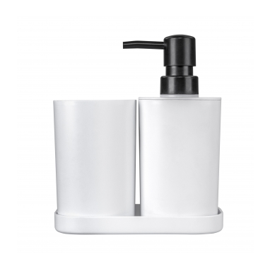 3-Piece Bathroom Set: soap dispenser, toothbrush holder, and soap dish, available in black and white.